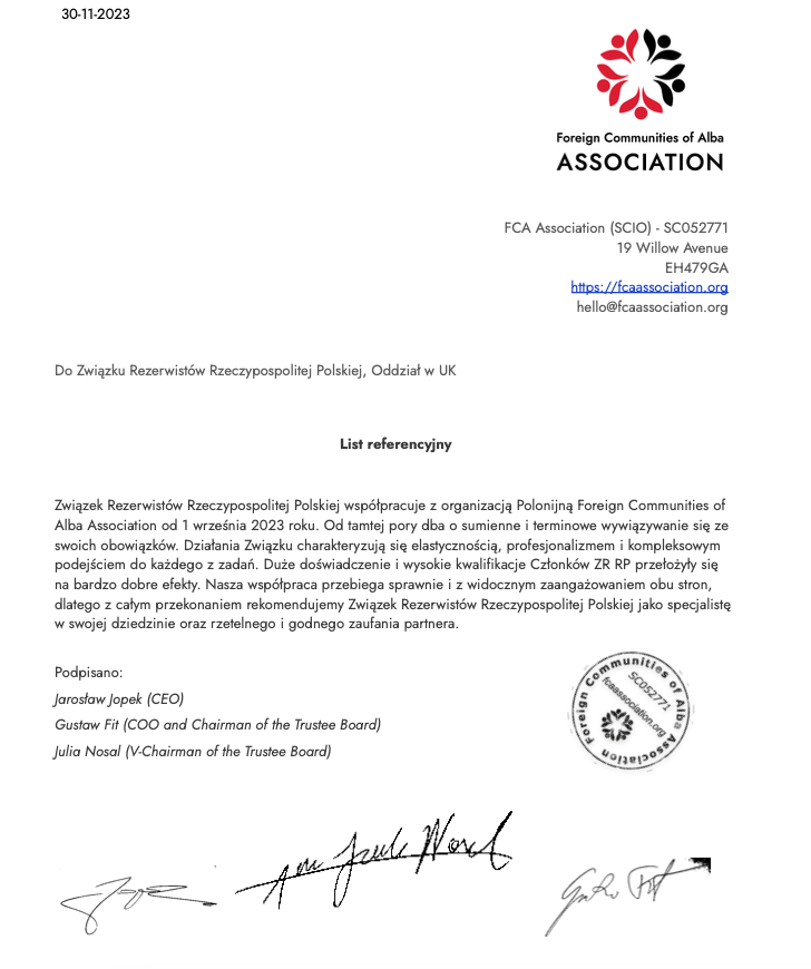 Z dumą ogłaszamy, że Foreign Communities of Alba Association została oficjalnym partnerem Związku Rezerwistów RP w UK! Otrzymaliśmy Certyfikat Przyjaciela, potwierdzający nasze zaangażowanie w społeczność mundurową.